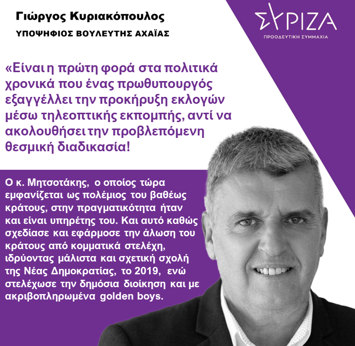 «Είναι η πρώτη φορά στα πολιτικά χρονικά που ένας πρωθυπουργός εξαγγέλλει την προκήρυξη εκλογών μέσω τηλεοπτικής εκπομπής, αντί να ακολουθήσει την προβλεπόμενη θεσμική διαδικασία! Στην απέλπιδα προσπάθεια του να εξωραϊσει την βαριά πληγείσα εικόνα, τόσο του ίδιου όσο και της κυβέρνησης του, από την ανείπωτη σιδηροδρομική τραγωδία των Τεμπών, ο κ. Μητσοτάκης επέλεξε να δώσει […]