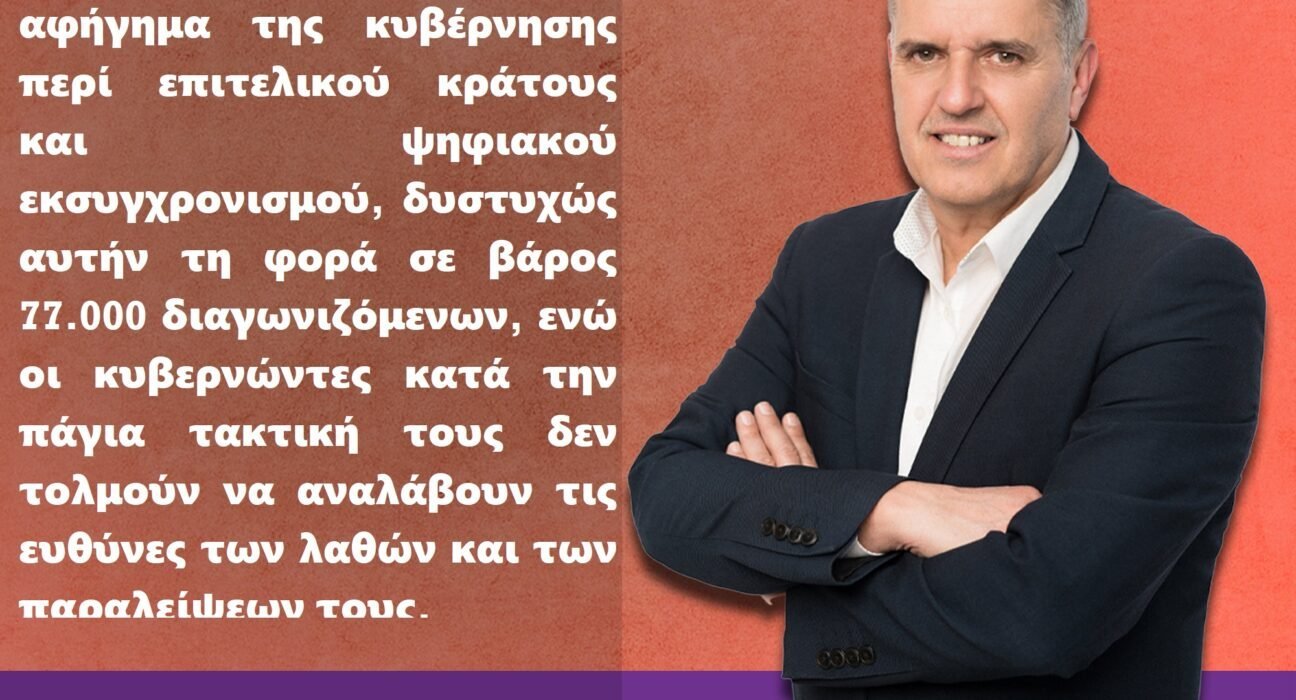 ΔΗΛΩΣΗ Γ.ΚΥΡΙΑΚΟΠΟΥΛΟΥ , ΥΠΟΨΗΦΙΟΥ ΒΟΥΛΕΥΤΗ ΑΧΑΪΑΣ ΤΟΥ ΣΥΡΙΖΑ-ΠΣ «Επιτελικό χάος και στον διαγωνισμό του ΑΣΕΠ» Για μια ακόμα φορά η κυβέρνηση του Κυριάκου Μητσοτάκη λειτούργησε με βασικό γνώμονα την επικοινωνία και όχι την ουσία. Δρομολόγησε έναν πανελλήνιο διαγωνισμό – μαμούθ, κάνοντας εμπόριο ελπίδας, καθώς στην πραγματικότητα επρόκειτο για μια πρόσκληση κατάταξης υποψηφίων σε έναν πίνακα […]